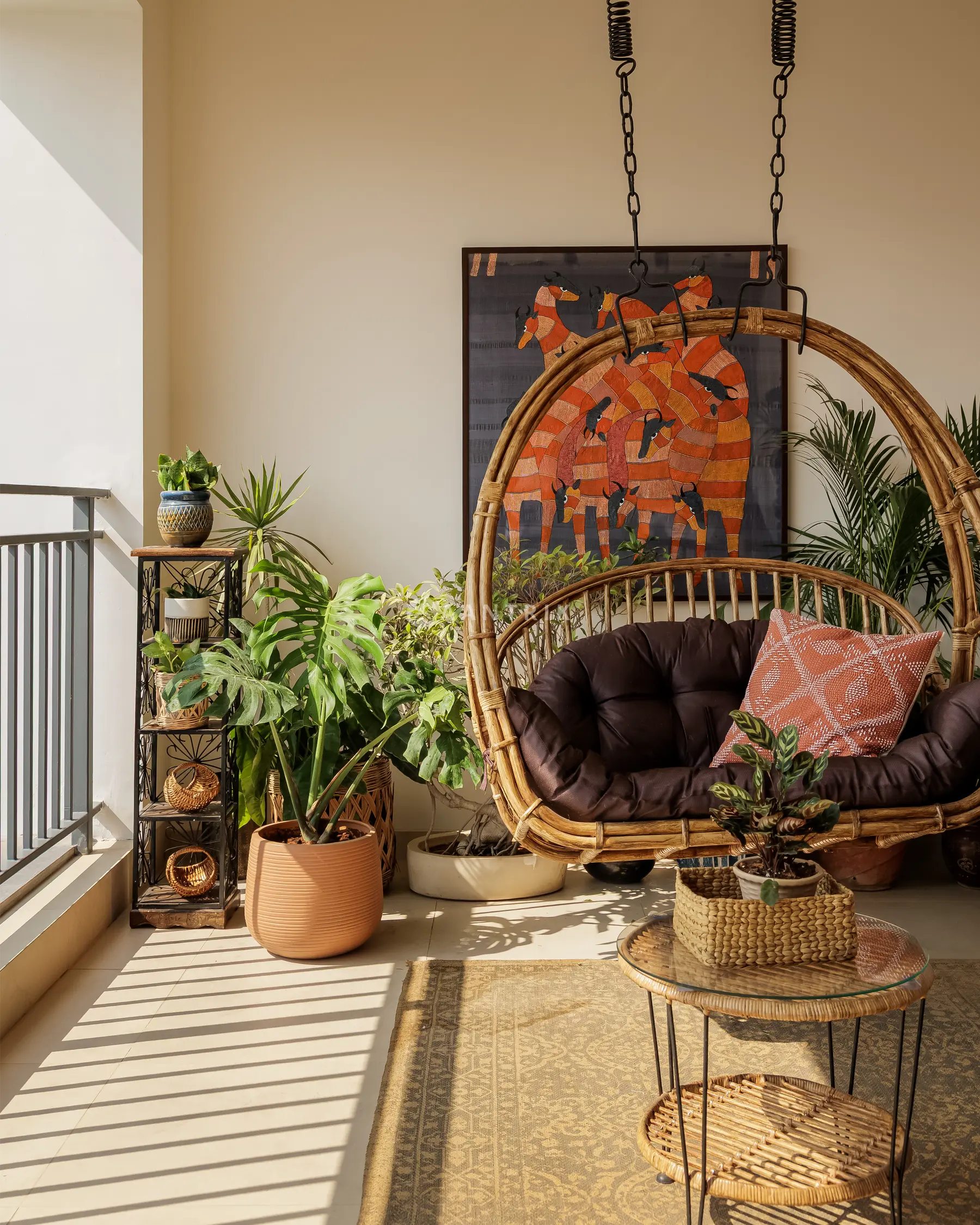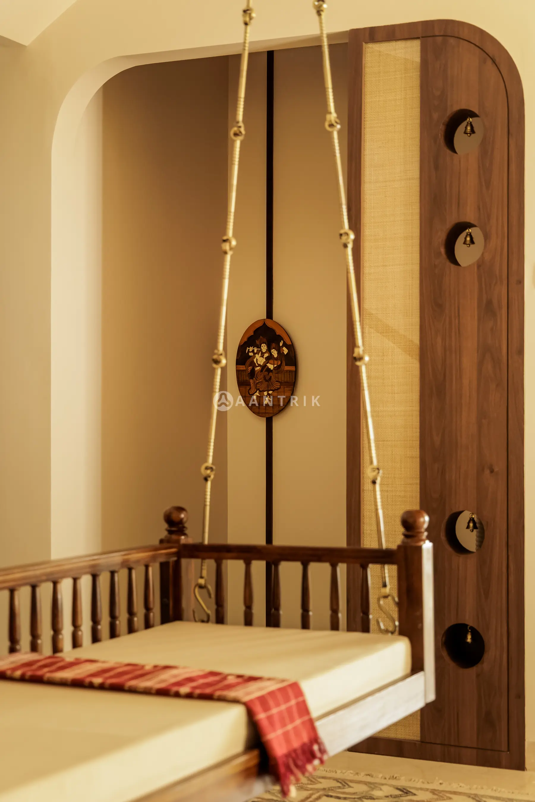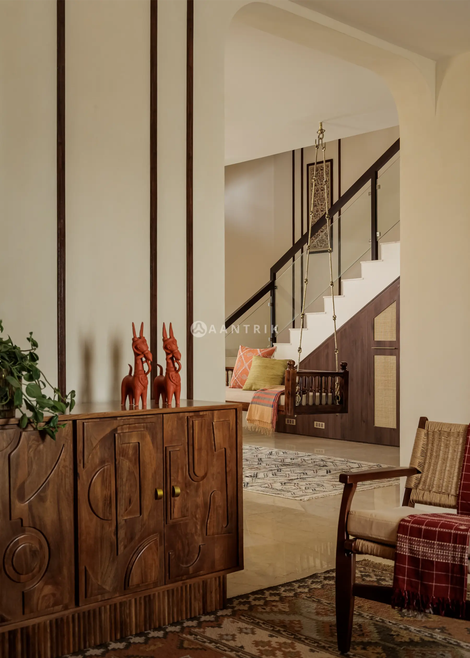 The home balances nostalgia with functional luxury, featuring a traditional wooden jhula as a centerpiece and a sun-soaked balcony retreat. This project celebrates a "minimalist ethnic" aesthetic, where artisanal craftsmanship meets clean silhouettes to create a serene, soulful haven. At Adarsh Sanctuary, we didn’t just design a space; we crafted an experience of grounded, high-design living.
